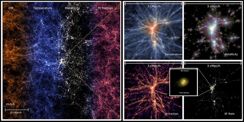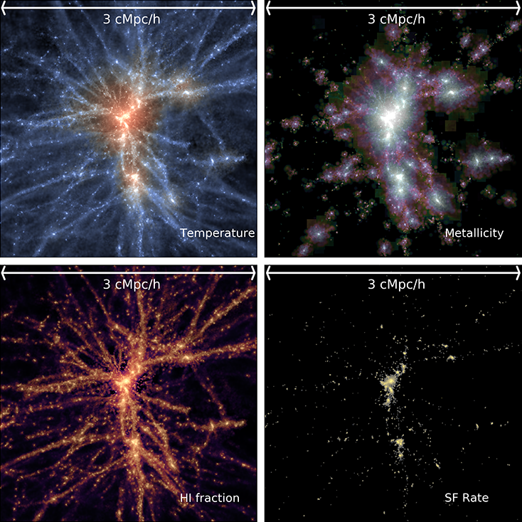 The simulation volume — 250 Mpc/h [megaparsec/hubble constant; an alternative measurement to light-years] across — includes for the first time a statistical sample of high redshift supermassive black holes at sufficient resolution to follow their host galaxies. We include a variety of physical models, including black hole growth, star formation, enrichment of intergalactic gas with metals, and gas physics.The black hole modeling in particular was based on a new treatment developed by graduate students Nianyi Chen and Yueying NI (both at CMU), tested just in time for this run. The treatment will allow us to make predictions for black hole mergers across cosmic history that the next-generation, space-based gravitational wave detector space, LISA (Laser Interferometer Space Antenna), will detect.