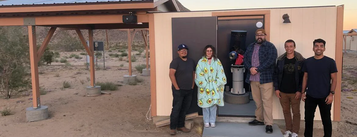 Header image shows five students who took Techniques of Observational Astronomy last quarter. They are seen here outside the telescope shed at GMARS before their first observing run. From left to right, the students are Alfredo Melendrez Oropeza, Sawsan Al Jashami, Christopher Rodriguez, Joshua Roth, and Christopher Perez. (UCR/George Becker)