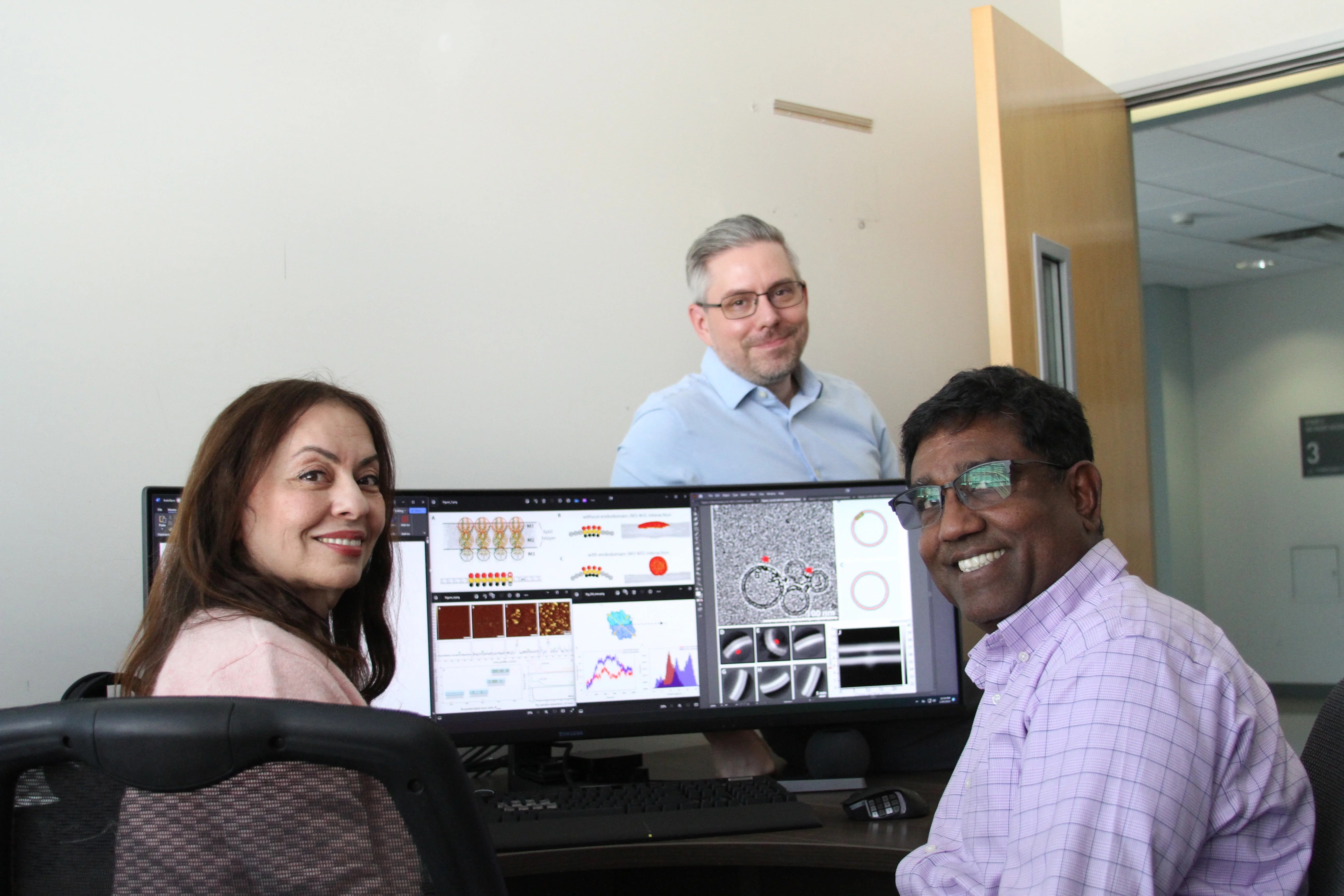 Kuhlman was joined in the research by fellow-UCR physicists Roya Zandi and Umar Mohideen. Kuhlman was charged with making the M proteins. Mohideen, a distinguished professor of physics and astronomy, used atomic force microscopy and cryogenic electron microscopy to measure how the M protein interacts with the membrane. Zandi, an expert on virus assembly and a professor of physics and astronomy, developed simulations of how the M proteins interact with each other and with the membrane.