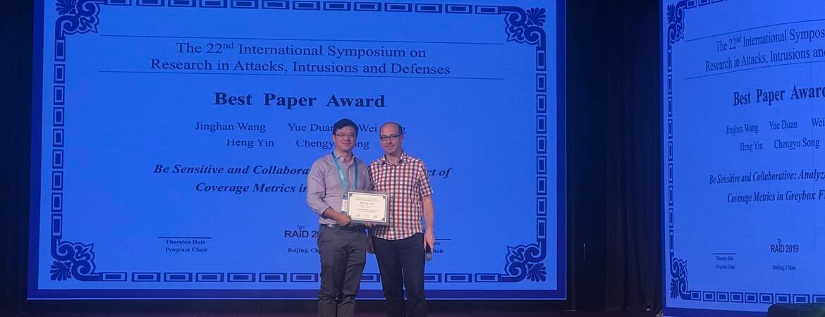 PhD Students Jinghan Wang, Yue Duan (now a postdoc at Cornell) and Wei Song working with Prof. Heng Yin and Prof. Chengyu Song received the best paper award of RAID 2019 (a leading conference in system security). In their paper entitled "Be Sensitive and Collaborative: Analyzing Impact of Coverage Metrics in Greybox Fuzzing", they formed a theoretical framework and conducted a systematic empirical study on the impact of different coverage metrics in greybox fuzzing, which serves as an important foundation for future research on fuzz testing and vulnerability discovery.