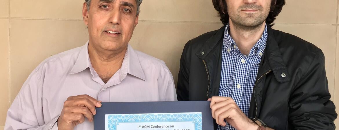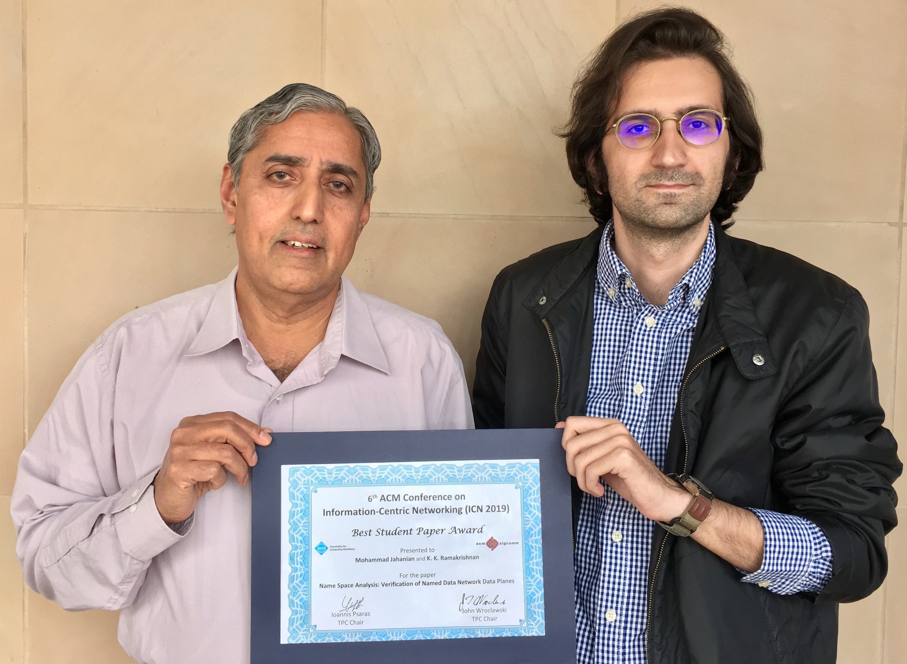 CSE PhD student Mohammad Jahanian and Prof. K. K. Ramakrishnan received the best student paper award (one of two top awards of the conference) in the 6th ACM conference on Information Centric Networking (the leading conference in Future Internet Architectures). In their paper titled "Name Space Analysis: Verification of Named Data Network Data Planes", they proposed a theoretical framework and tool for checking the correctness of NDN data planes, with regards to their information-centric network-wide properties. Their paper opens a new avenue for addressing and designing formal methods for the verification of complex name-based, information-centric networks. The work has been done with the support of grants from NIST and NSF for designing techniques to improve emergency response for disasters.