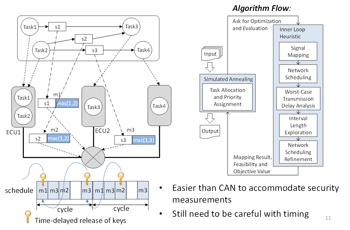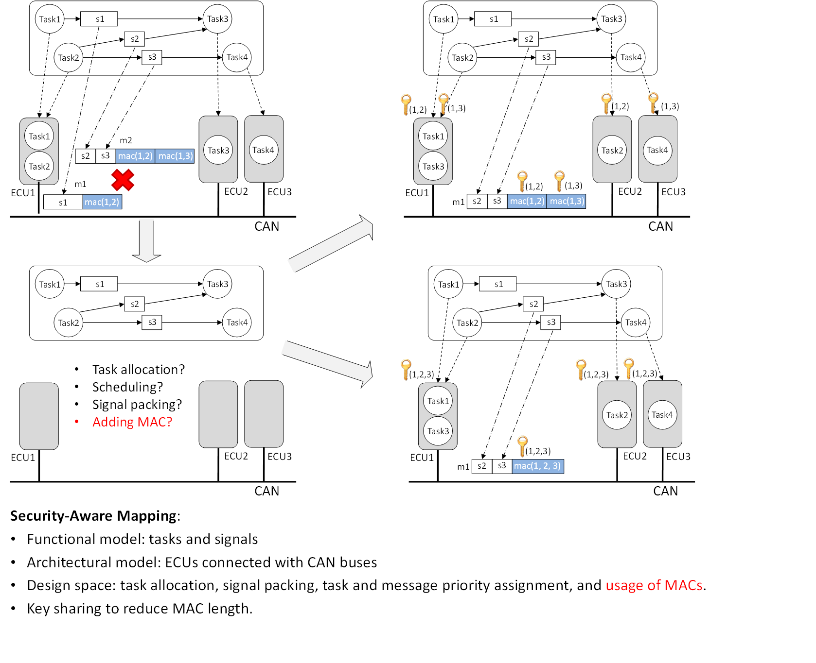 This work provides insights and guidelines for embedded systems with limited resources and strict timing constraints, and proposes a general security-aware design methodology to address security with other design constraints in a holistic framework and optimize design objectives. We further developed algorithms for applying cyber-security techniques to the currently prevalent CAN (Controller Area Networks) architecture and to the next generation TDMA (time division multiple access) based automotive architecture, while considering resource and timing constraints.